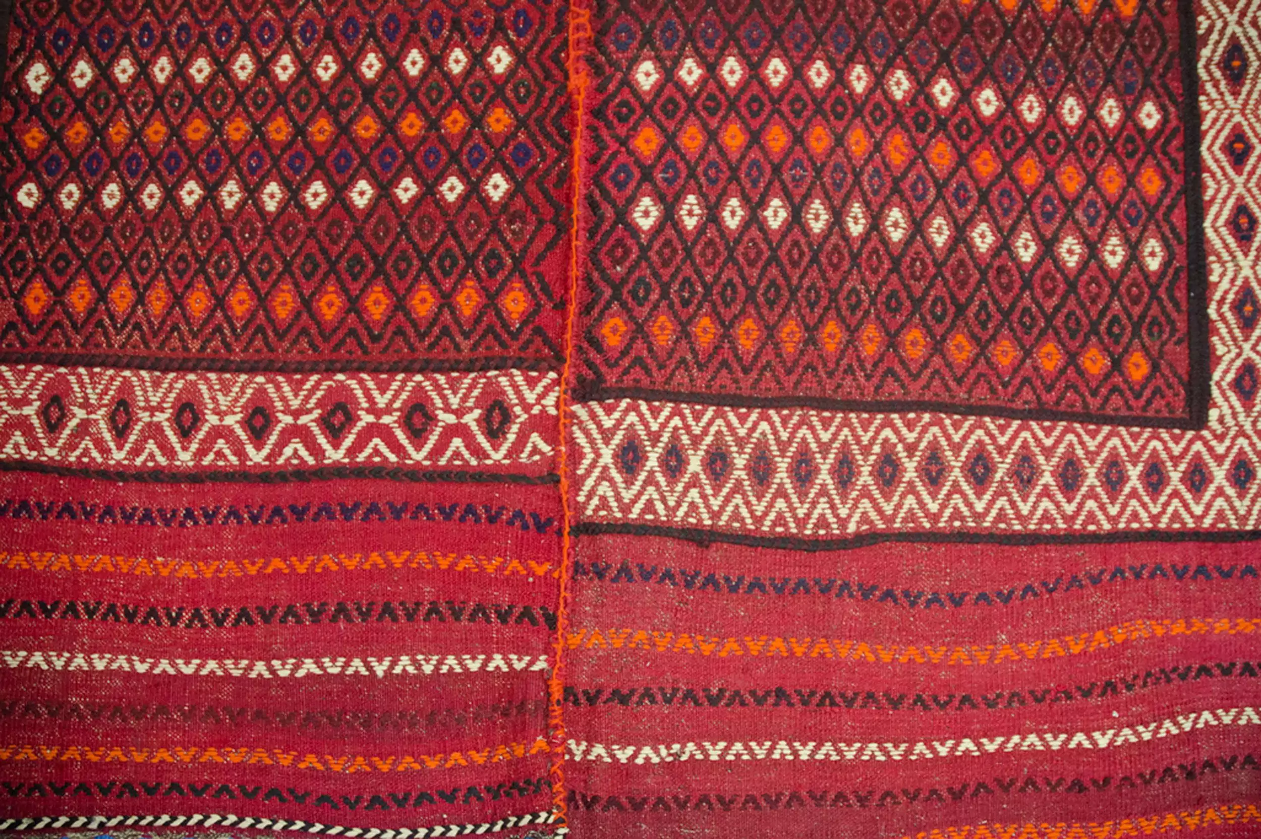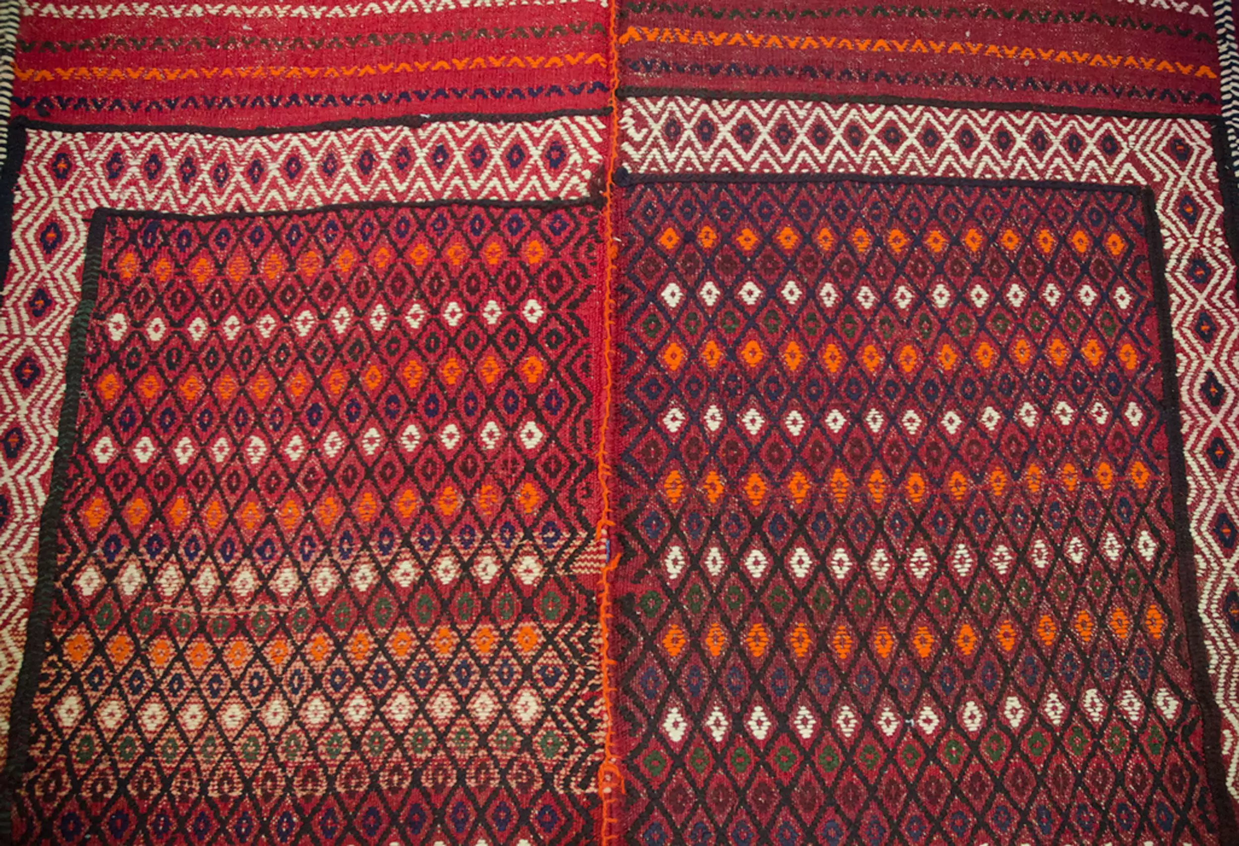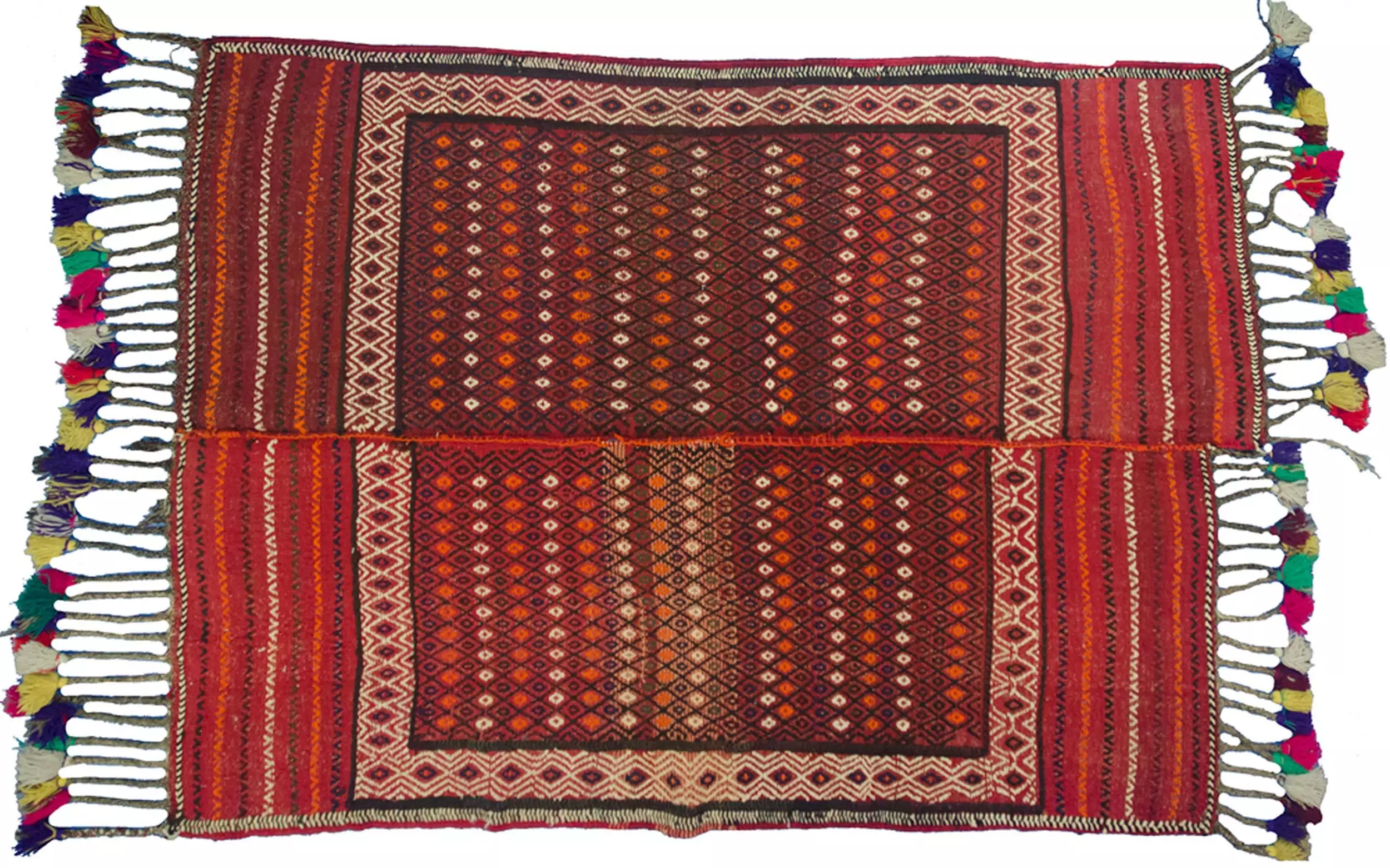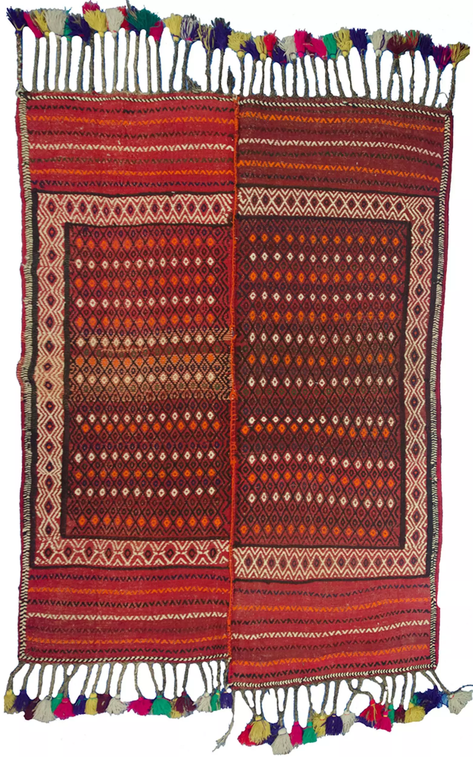 What truly sets this kilim apart is its multicoloured pompom fringes—a rare and joyful detail that adds a playful finish while showcasing the weaver’s creativity. The kilim was woven in two panels, then hand-stitched together, a typical construction method for Shiraki kilims. The result is a highly collectable textile that tells a story of nomadic life and craftsmanship.