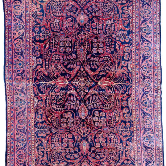 What truly sets this piece apart is its unusual light purple floral border—a rare and visually striking frame that elevates the entire design. This subtle use of colour gives the rug a unique charm, making it equally suited to traditional interiors and contemporary spaces looking for a touch of classical flair.