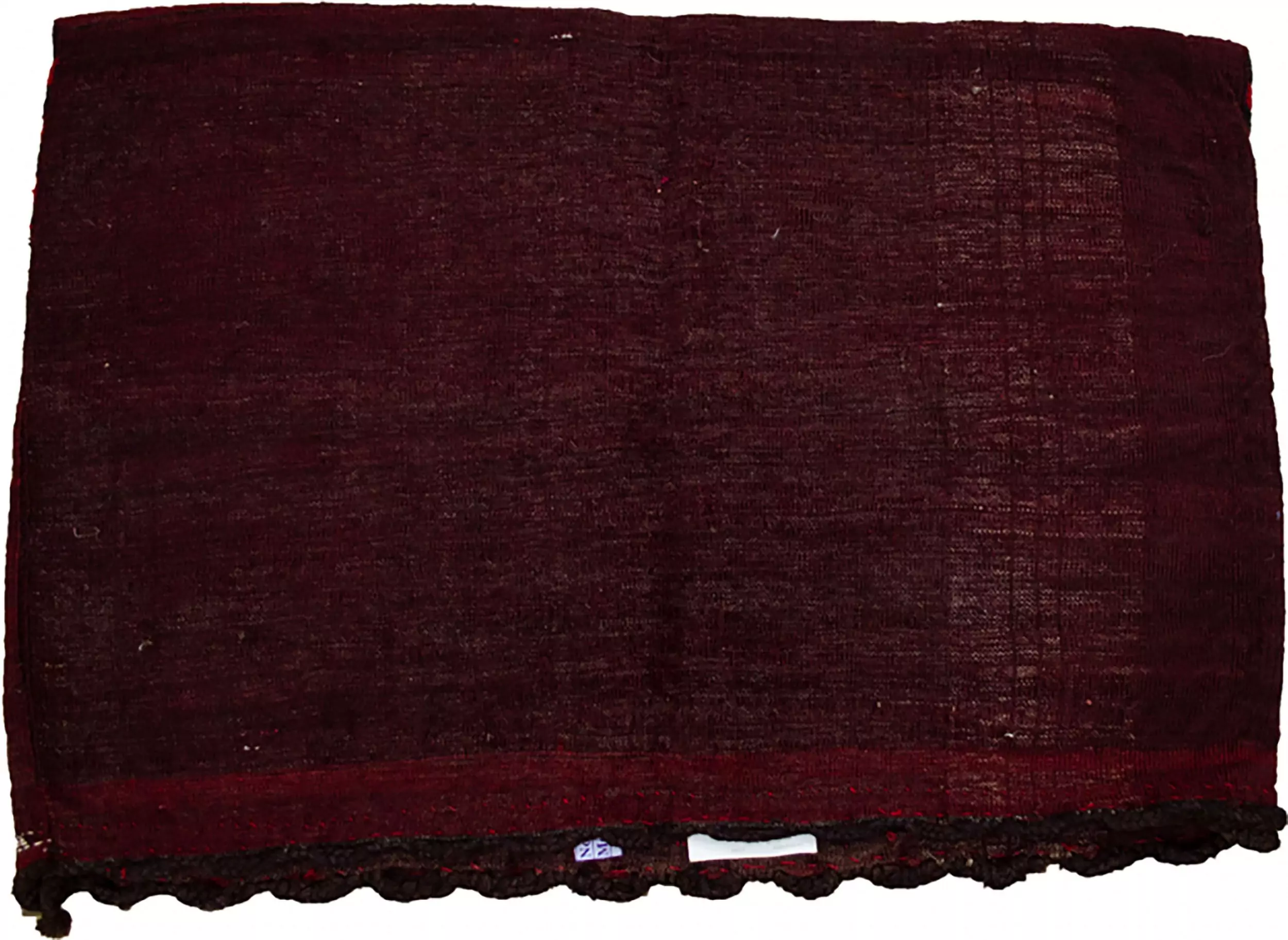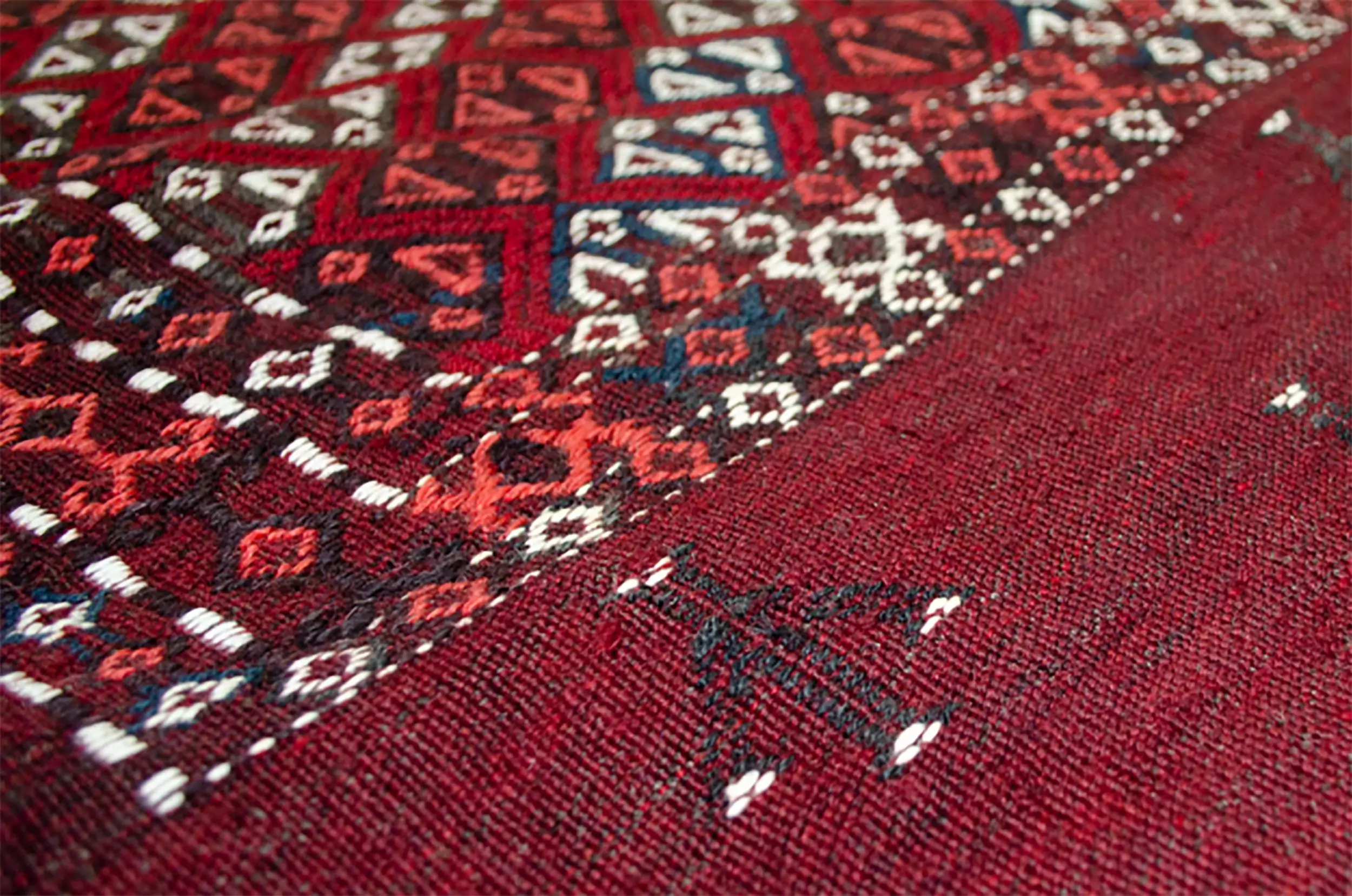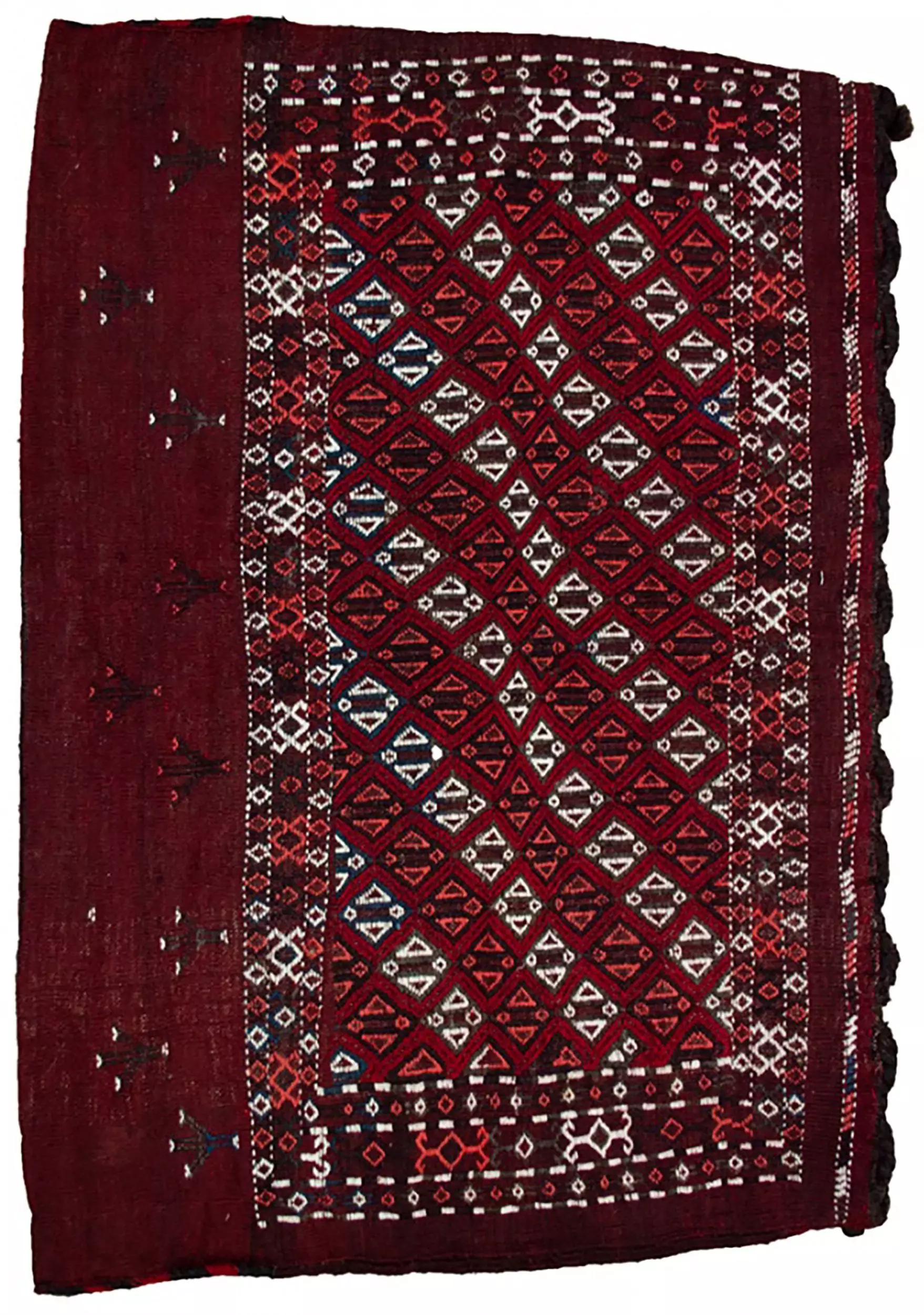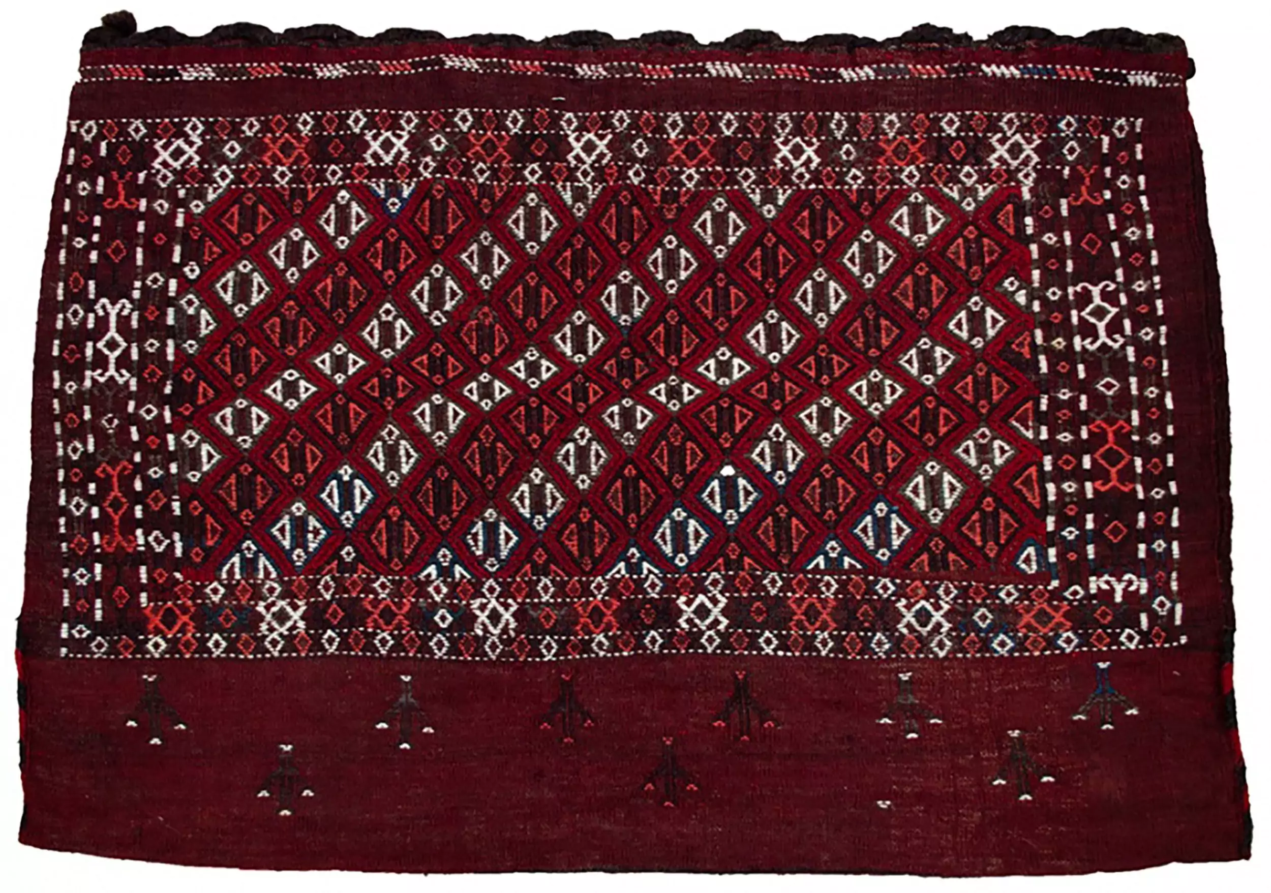 The bag’s defining feature is its deep maroon field, a classic Turkman colour that lends it a sense of richness and formality. At the center, a series of well-placed lozenge motifs draw the eye, symbolising protection and continuity in tribal symbolism. Below, a scattering of stylised bushes adds charm and organic contrast to the geometric layout, grounding the design in nature.