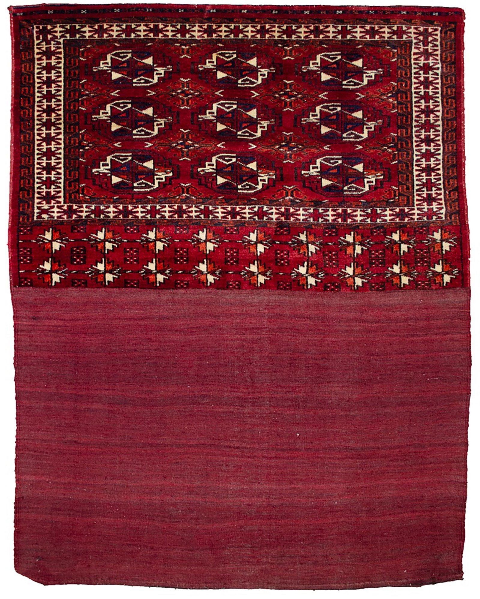 The bag displays a deep, rich red ground—a signature of Turkman weaving—accentuated by large central Guls, traditional motifs that represent tribal identity and protection. These bold, geometric patterns are not only decorative but also deeply rooted in cultural heritage.