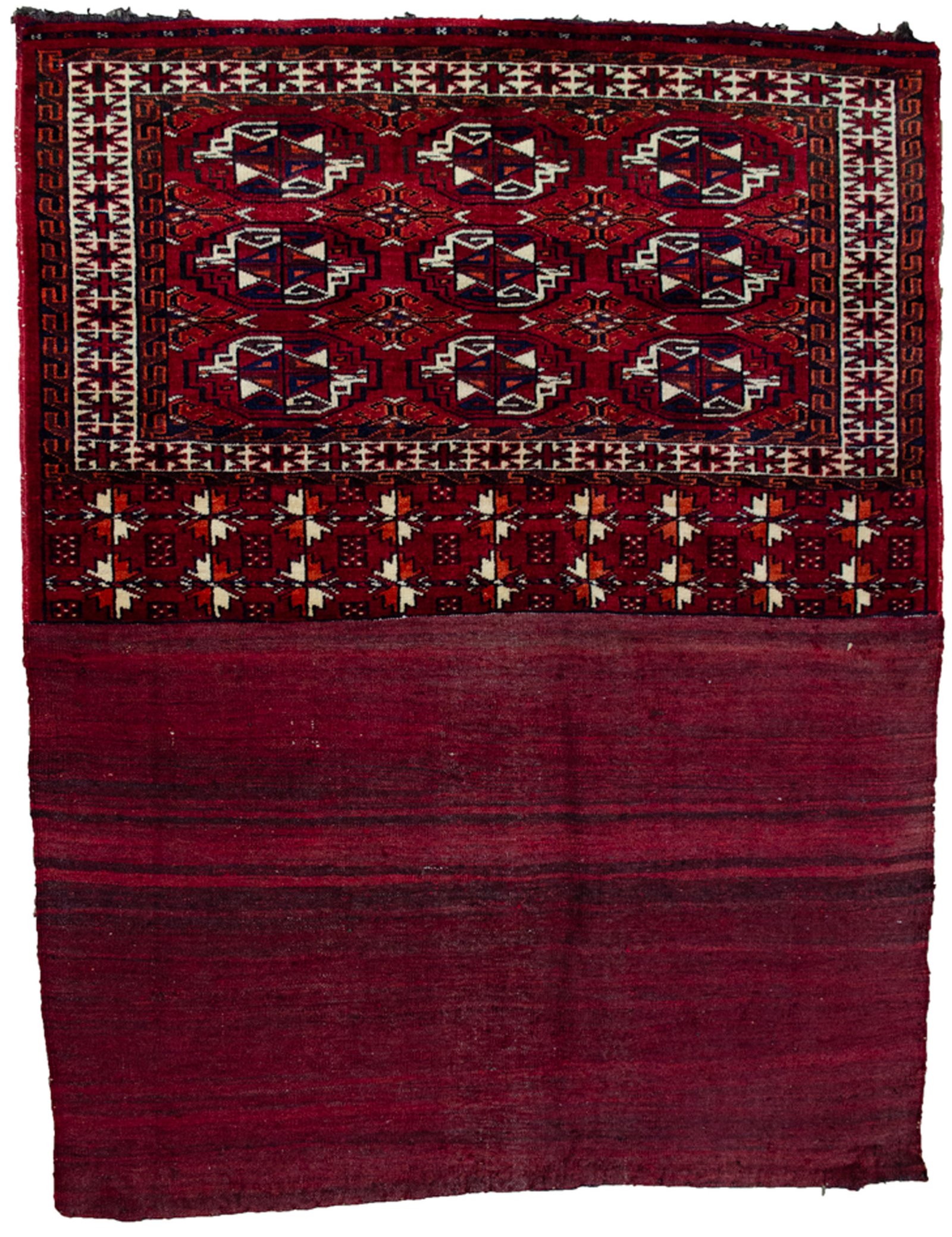 The bag displays a deep, rich red ground—a signature of Turkman weaving—accentuated by large central Guls, traditional motifs that represent tribal identity and protection. These bold, geometric patterns are not only decorative but also deeply rooted in cultural heritage.