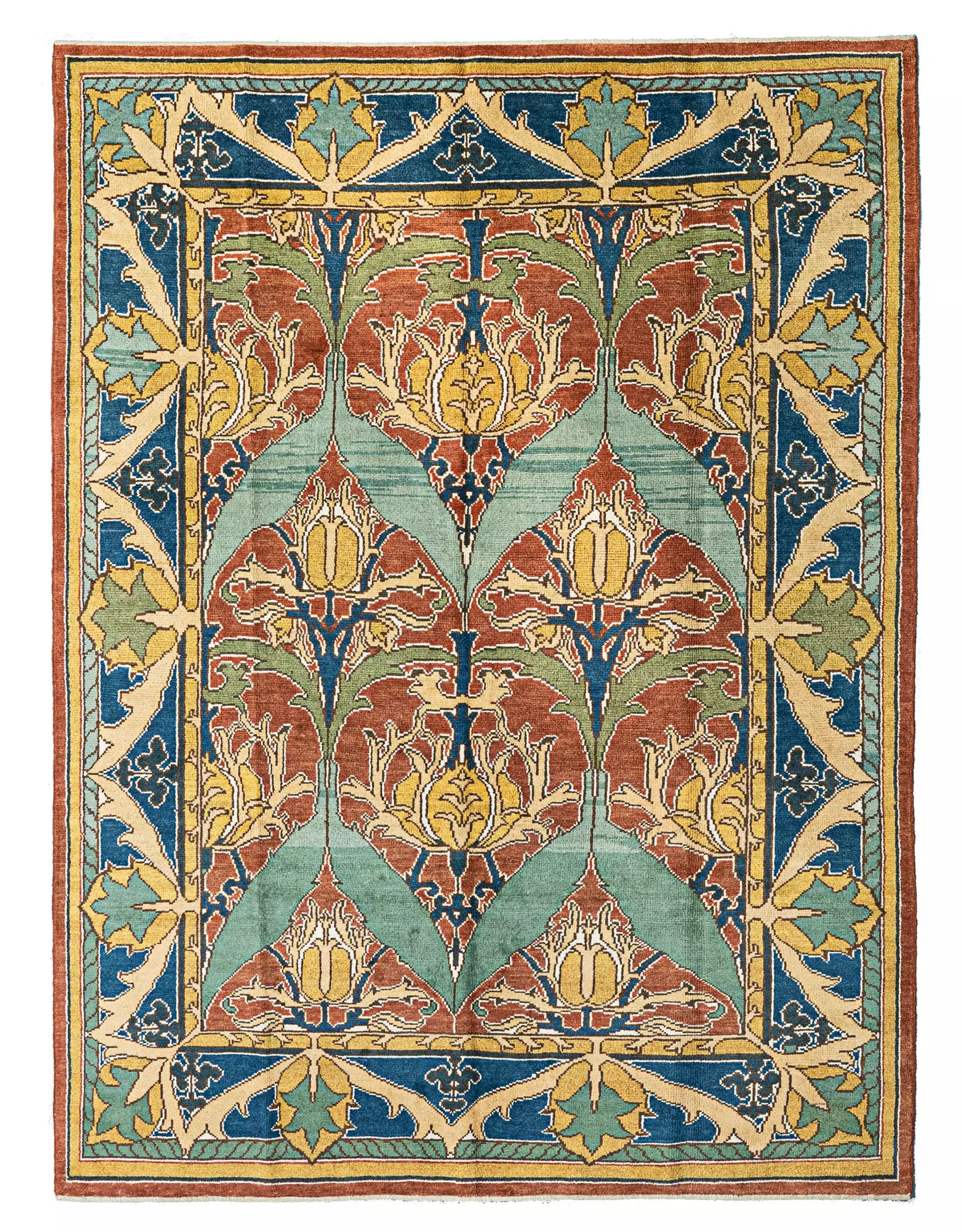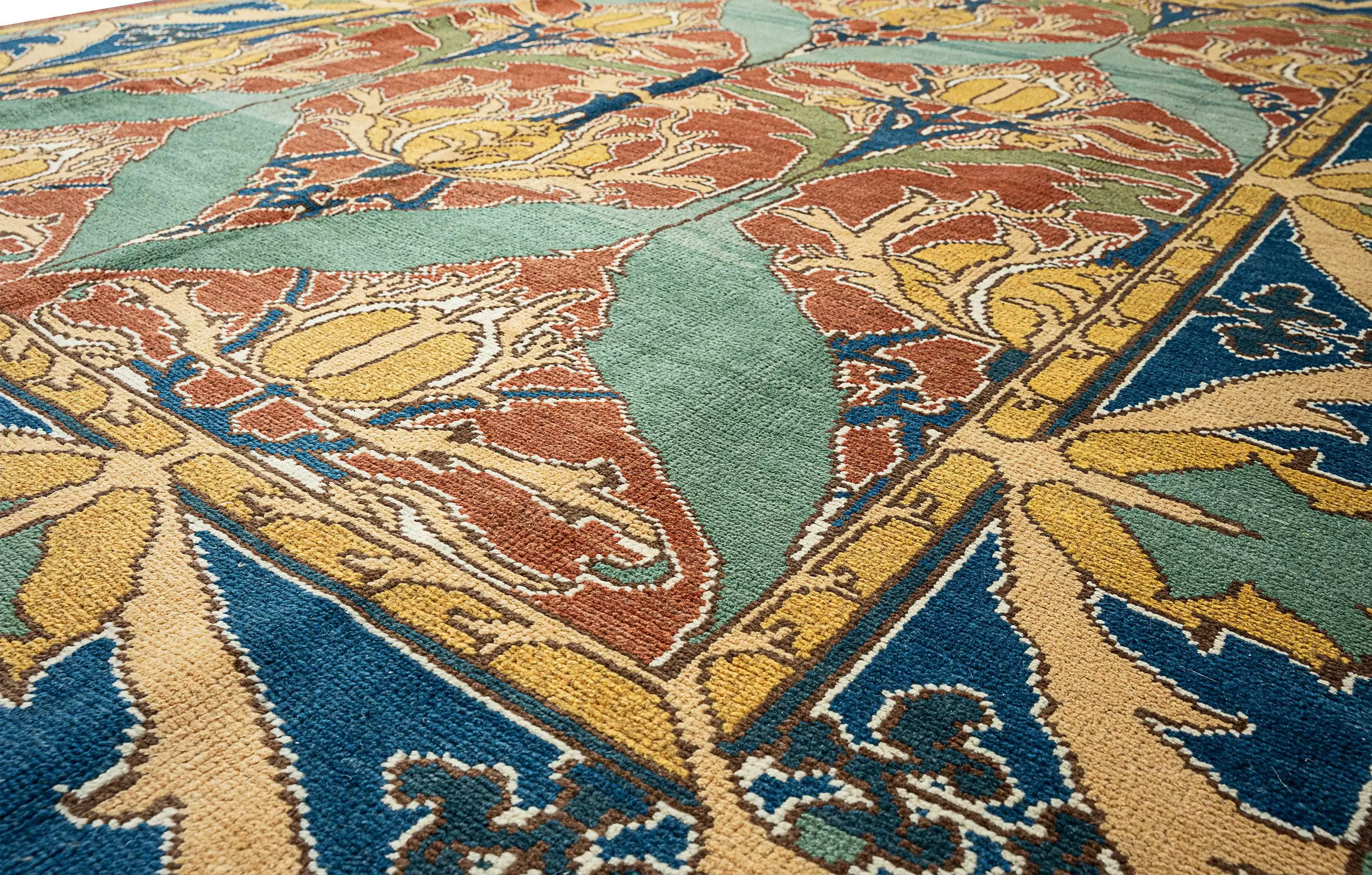We have yet to discover any hand-knotted reproductions of Voysey’s remarkable work that can compare to the exceptional quality of ours. Our unwavering dedication to mastering traditional knotting techniques, combined with a meticulous eye for detail, has enabled us to create a piece that pays homage to one of the most esteemed designers of the Arts and Crafts movement. Crafted from luxurious high-quality wool and dyed with natural pigments, this rug not only promises durability but also evolves into a cherished family heirloom.