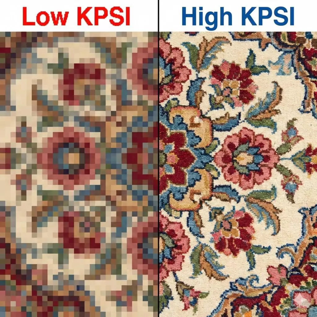 If you are looking at a classic Persian city rug (like a Tabriz, Nain, or Isfahan) featuring swirling vines, perfect circles, or realistic flowers, KPSI is critical.